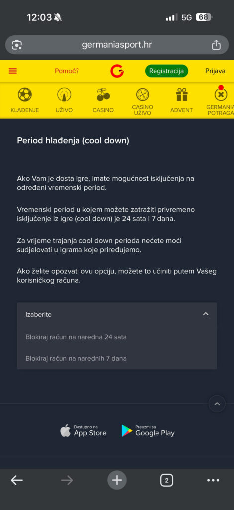 Za privremenu deaktivaciju korisničkog računa možete koristiti opciju hlađenja putem vlastitog korisničkog računa. Potrebno je kliknuti na Moj račun, zatim odabrati obrazac Odgovorno igranje te kliknuti na riječ ovdje, nakon čega možete unijeti željeni period hlađenja.